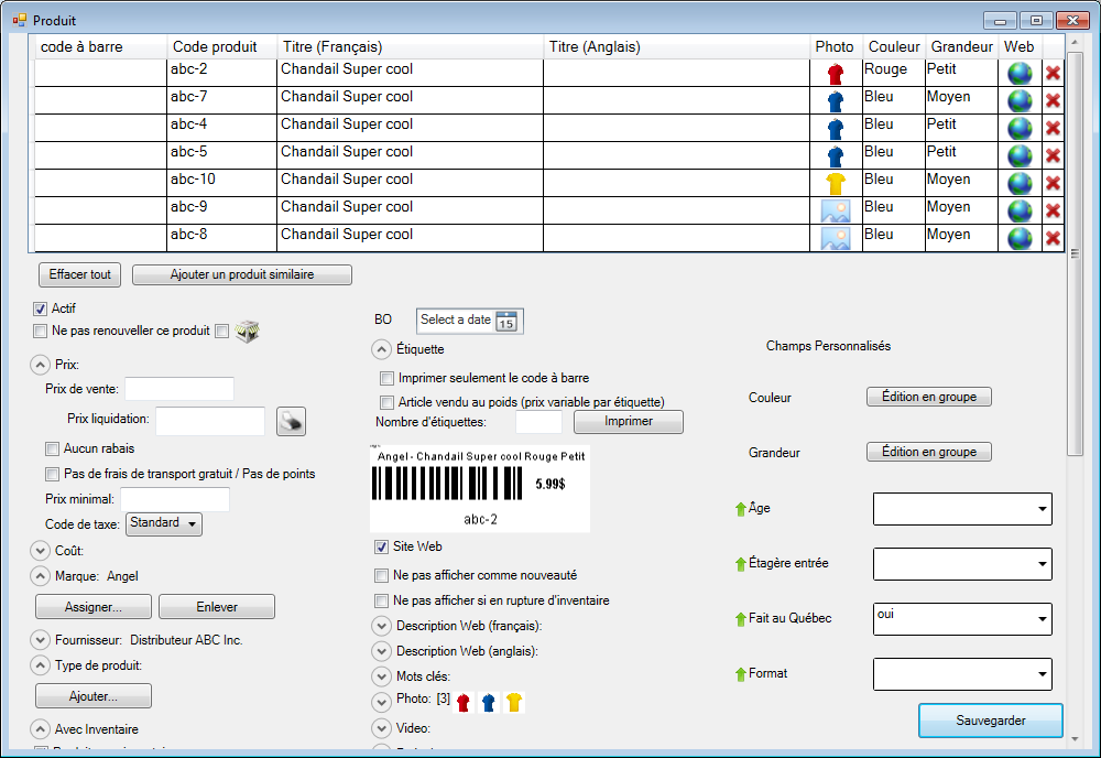 - Les champs personnalisés Couleur et Grandeur sont modifiés en mode "grille",