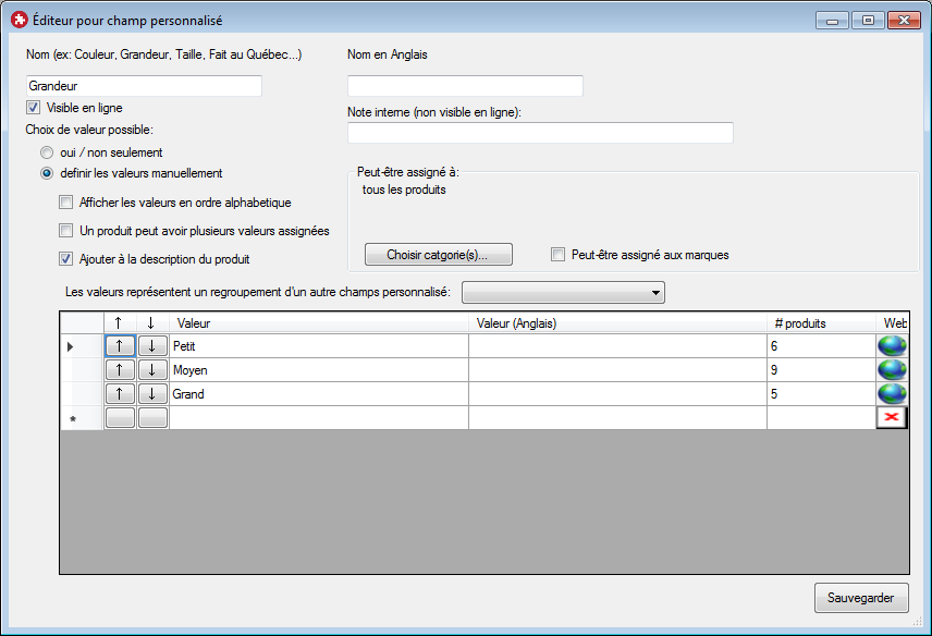 Vous pouvez restreindre ce champ à certains produits. Par exemple: la grandeur de soulier ne devrait pas s'appliquer aux grandeurs de chandails.