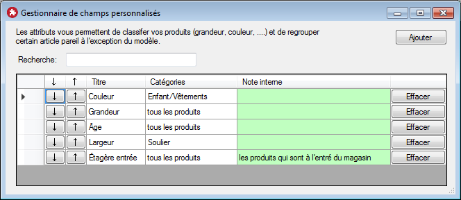Comelin vous offre de créer vos propres champs personnalisés (grandeurs, couleurs, etc.).