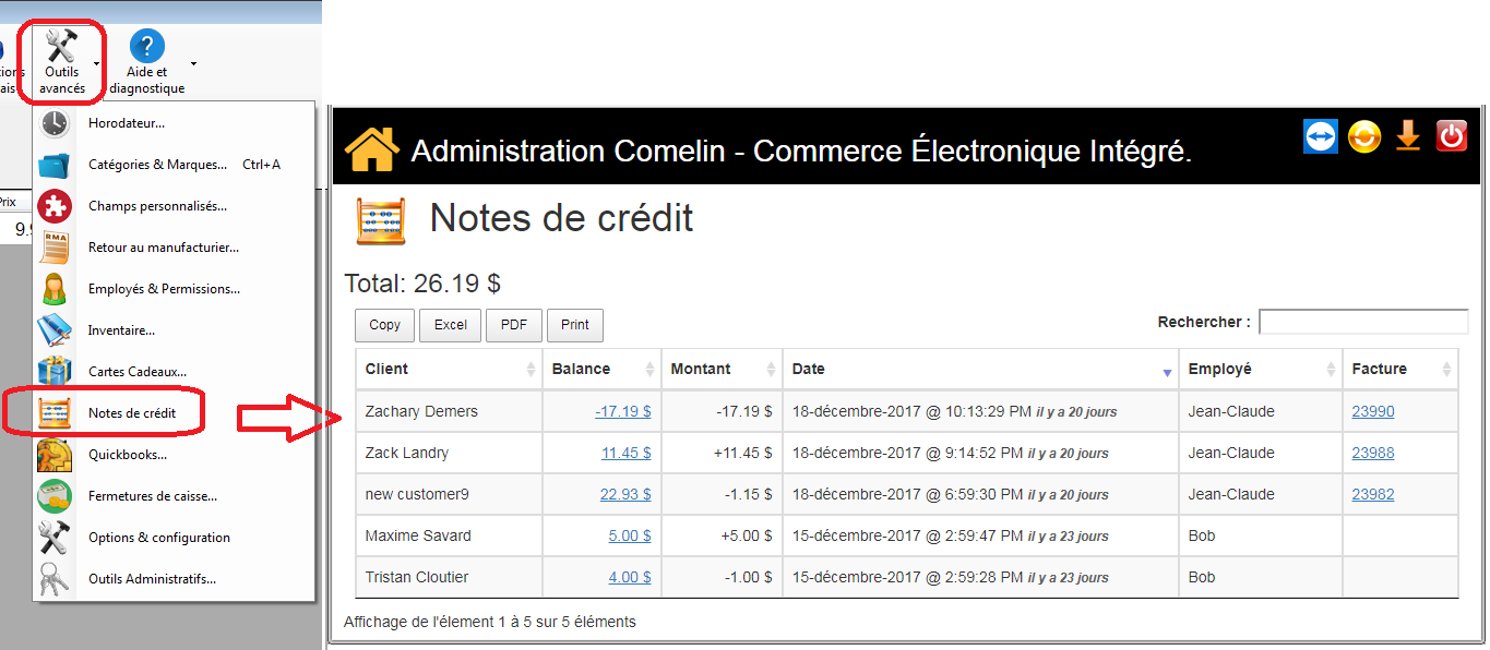 Un rapport est disponible via le menu Outils avancés - Notes de crédit. De la page web, il y a des champs de recherche et exportation via Excel